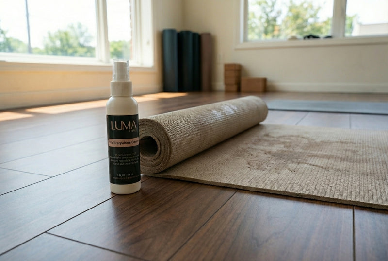 Post-workout clean: yoga mats, resistance bands, dumbbells, stroller handles